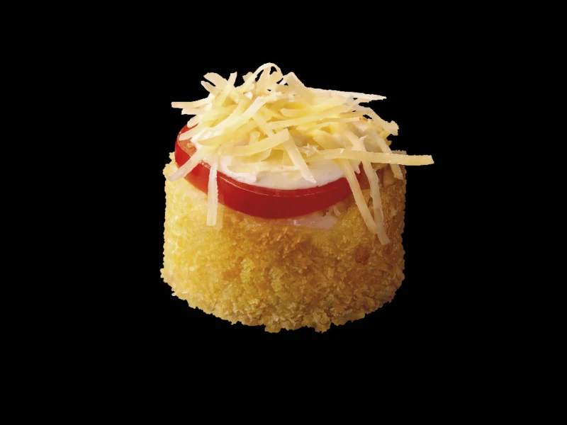Жареный ролл с копченой курицей, сыром гауда, соусом цезарь, томатами черри и сыром пармезан