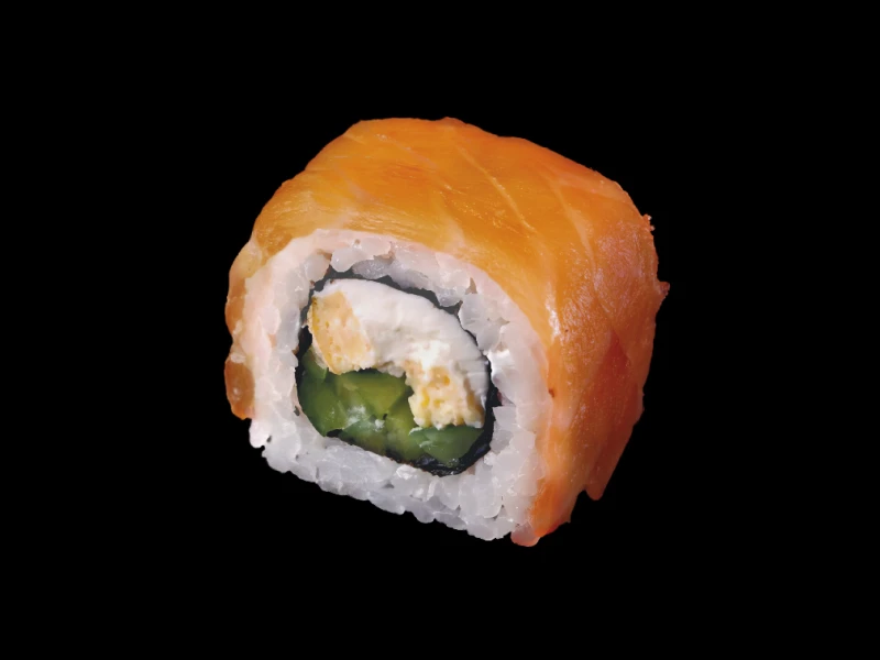 Ролл с лососем, сливочным сыром, японским омлетом и огурцом