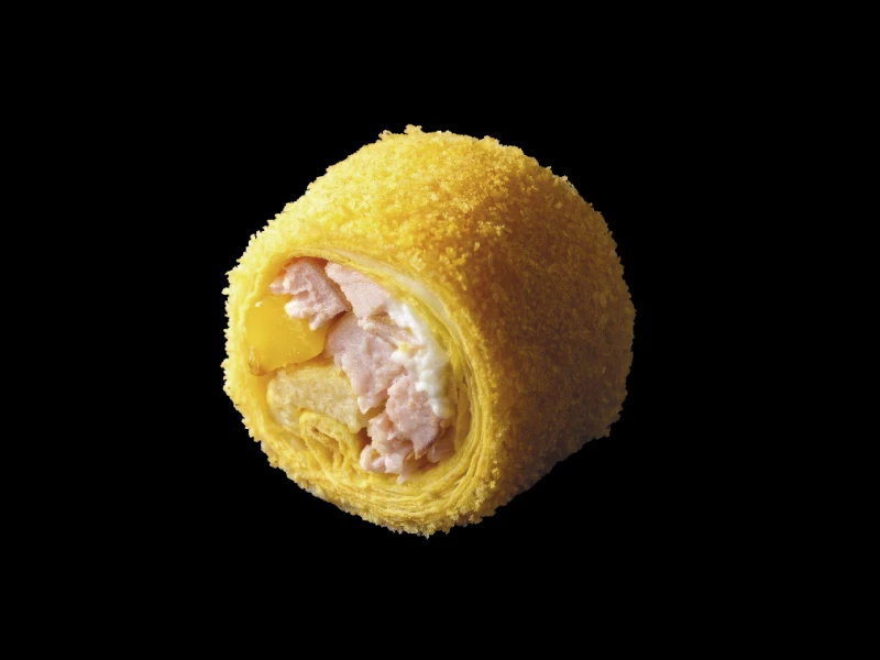Жареный ролл с копченой куриной грудкой, сливочным сыром, сыром гауда и японским омлетом