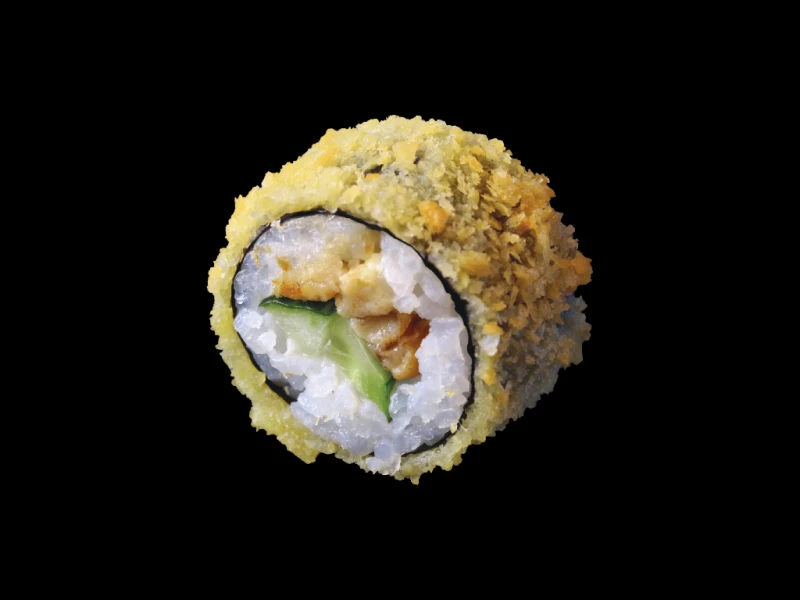 Жареный ролл с копченым угрем, плавленым сыром и огурцом