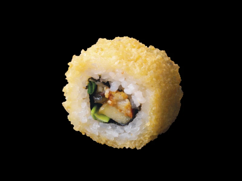 Жареный ролл с угрем, японским омлетом, зеленым луком и соусом спайси
